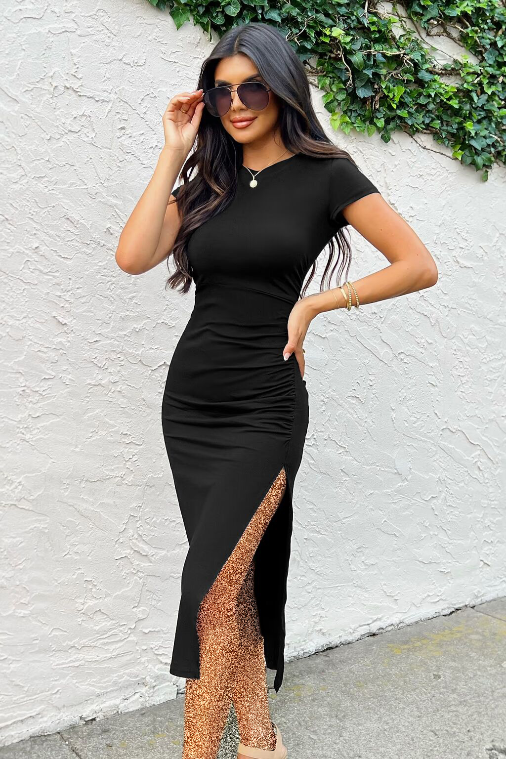 با لباس آستین کوتاه یقه گرد مدل چیندار، انحناهای بدنتان را به نمایش بگذارید. این لباس مجلسی جذاب، کشسانی فوقالعادهای دارد، بنابراین میتوانید تمام شب احساس زیبایی و راحتی داشته باش