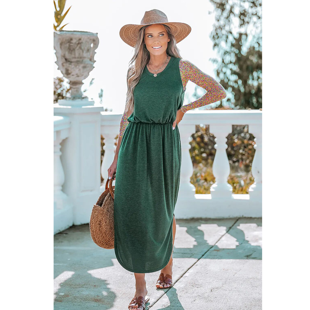 یقه گرد ، بدون آستین ، کمر چین دار ، چاک کناری ، لبه نامتقارن ، ماکسی ، طرح H شکل ، روش شستشو: معمولی ، جنس: 64% پلی استر، 30% ابریشم مصنوعی، 6% اسپندکس