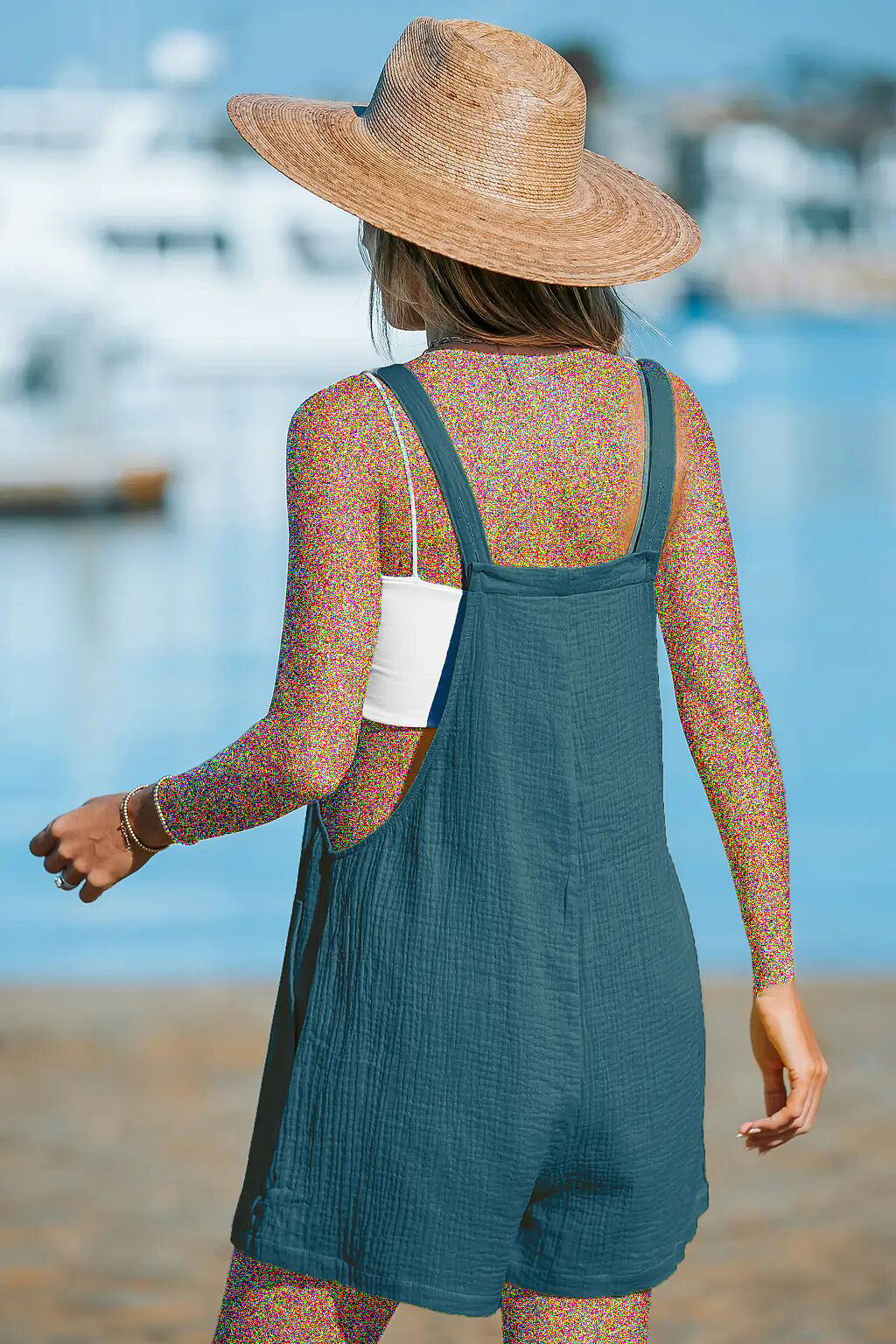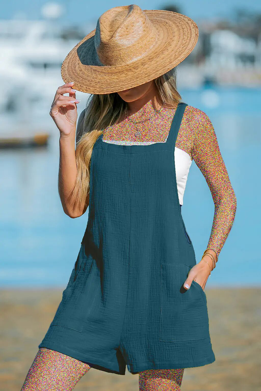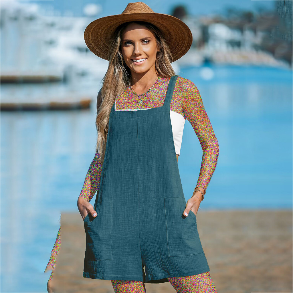 یقه مربعی ، بدون آستین ، جیبهای مورب کناری ، دمپا گشاد ، روش شستشو: معمولی ، جنس: ۱۰۰٪ پنبه